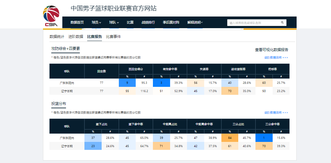 数据方面,广东队与辽宁队的篮板总数比为40-49,助攻总数比为10-26,三分命中率比则为15.6%-39.3%,广东队全方位落后。